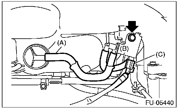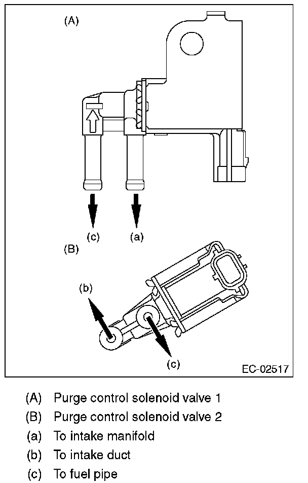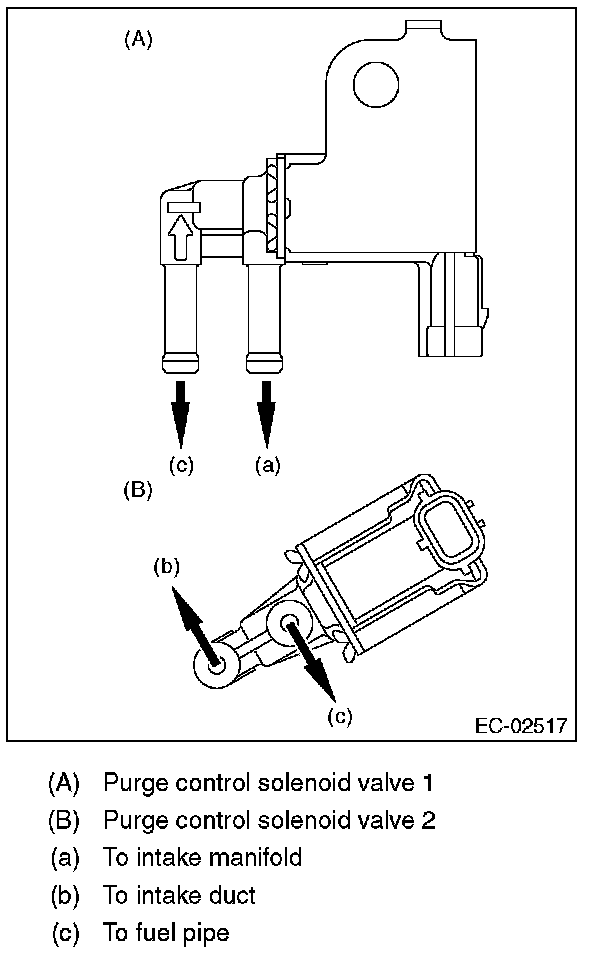 4. Disconnect the vacuum hose (B) and the connector (C) from the fuel pipe, and remove the purge control solenoid valve 1 from the intake manifold.