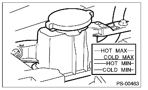 3) Inspect the fluid level of reservoir tank with vehicle on level surface and engine stopped.