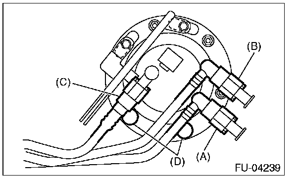 7. Disconnect the quick connectors of fuel delivery tube (A), fuel return tube (B), and jet pump tube (C).