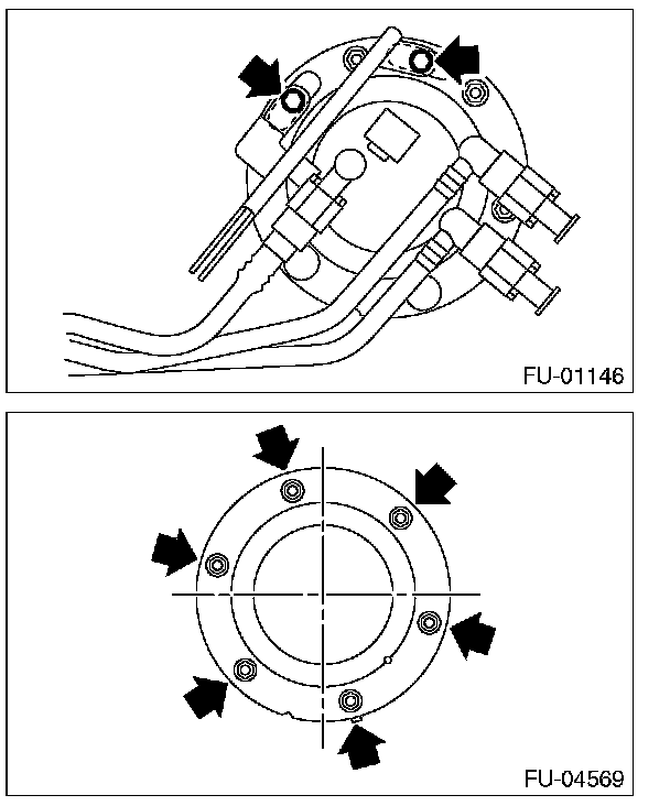 9. Remove the bolts and nuts which hold fuel sub level sensor protector and fuel sub level sensor upper plate to the fuel tank.