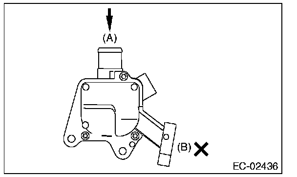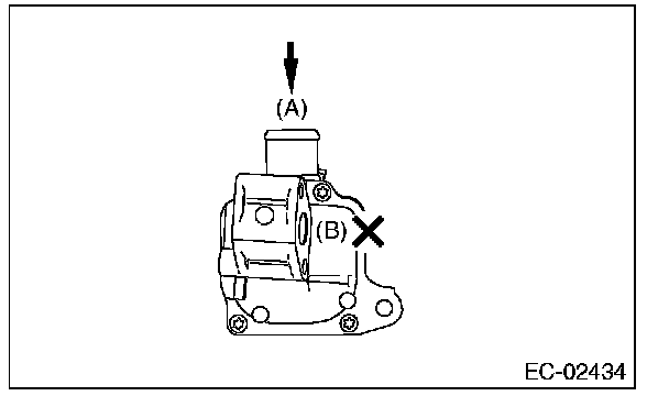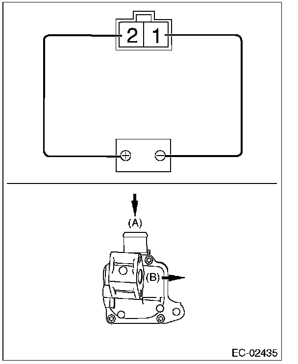 4. With terminal No. 2 connected to the battery positive terminal and terminal No. 1 to the battery ground terminal, check that air comes out from (B) when air is blown into (A).