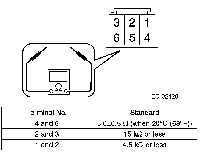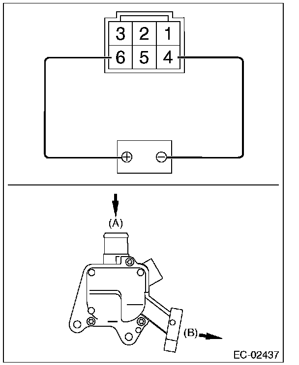 4. With terminal No. 6 connected to the battery positive terminal and terminal No. 4 to the battery ground terminal, check that air comes out from (B) when air is blown into (A).
