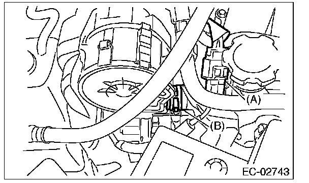 4. Disconnect the connector (A) and air duct (B) from secondary air pump and remove the secondary air pump.