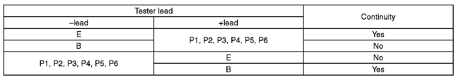 1. Check for continuity between the diode lead and terminal E or B. If continuity is not as shown in the table, replace the rectifier.