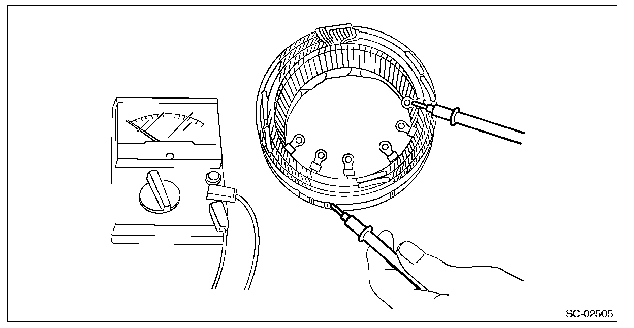 Inspect the continuity between the stator coil stator core and lead wire terminals. If there is continuity, replace the stator coil because the stator coil is grounded.