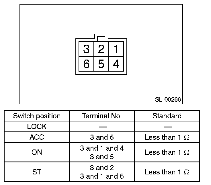4. Turn the ignition key plate to each position and check the resistance between ignition connector terminals.