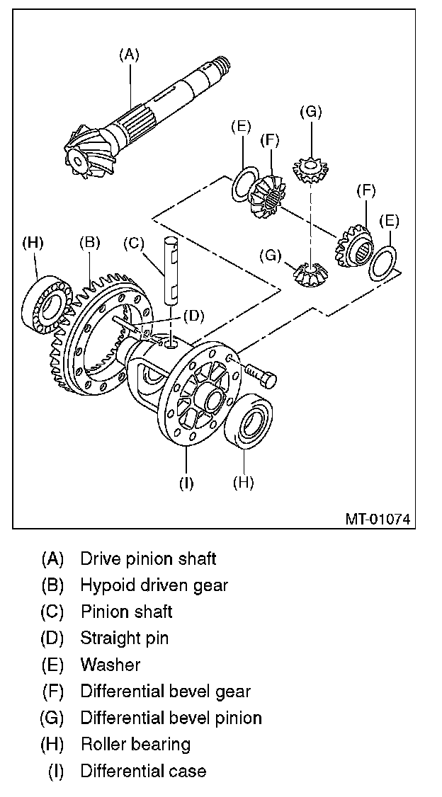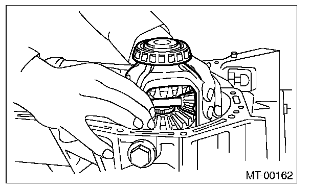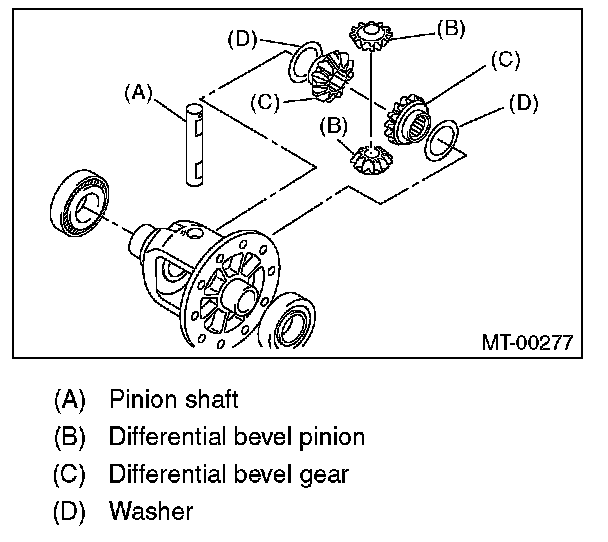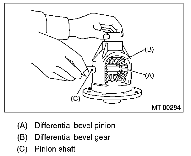 1) Install the differential bevel gear and differential bevel pinion together with washer, and insert the pinion shaft.