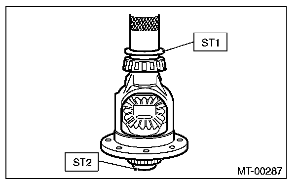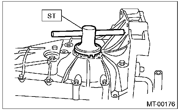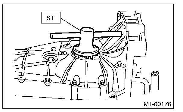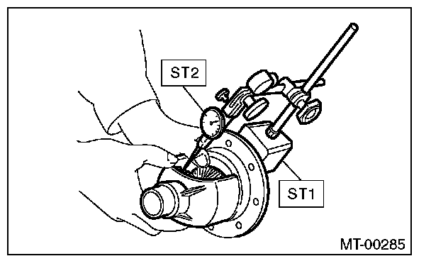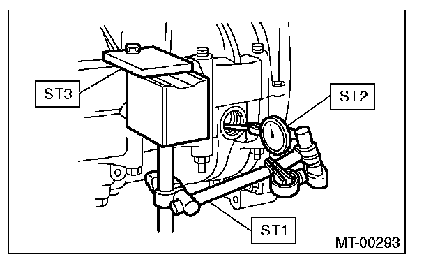 1) Set the ST1, ST2 and ST3. Insert the needle through transmission oil drain plug hole so that the needle comes in contact with the tooth surface on the right corner, and check the backlash.