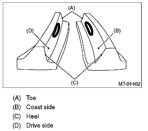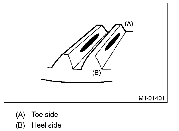 Check item: Tooth contact surface is slightly shifted toward the toe side under a no-load condition. (When driving, it moves towards the heel side.)