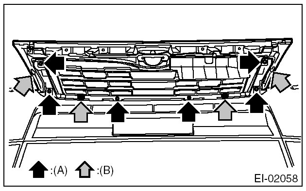 3. Detach the tabs (B) and remove the front grille assembly.