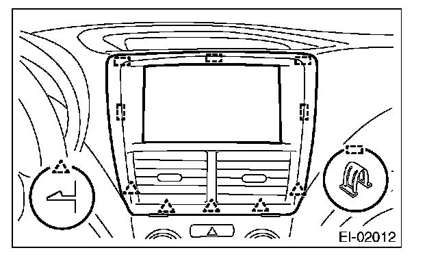 8. Detach the screws and the plastic hooks to remove the ornament panel RH.