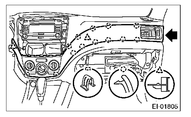 5. Detach the plastic hooks (A) and remove the instrument panel side cover RH.
