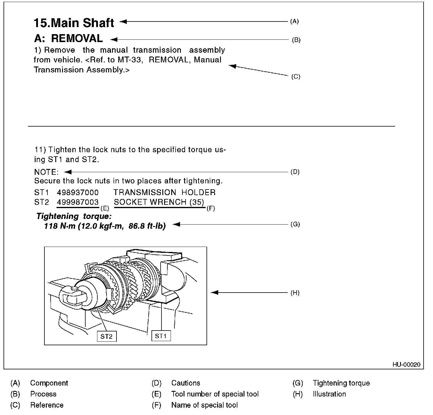 CAUTION: Describes prohibited matters to prevent vehicle or parts damage, or matters that requires special attention during work.