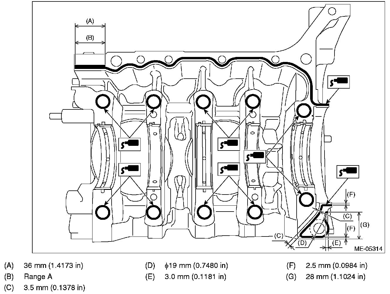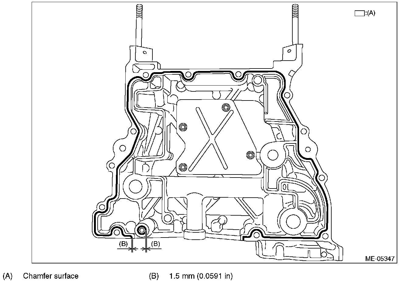 ^ Apply liquid gasket 1.5 mm (0.0591 in) outside from the chamfer surface. However, application of liquid gasket on the chamfer surface around the bolt hole is allowed.
