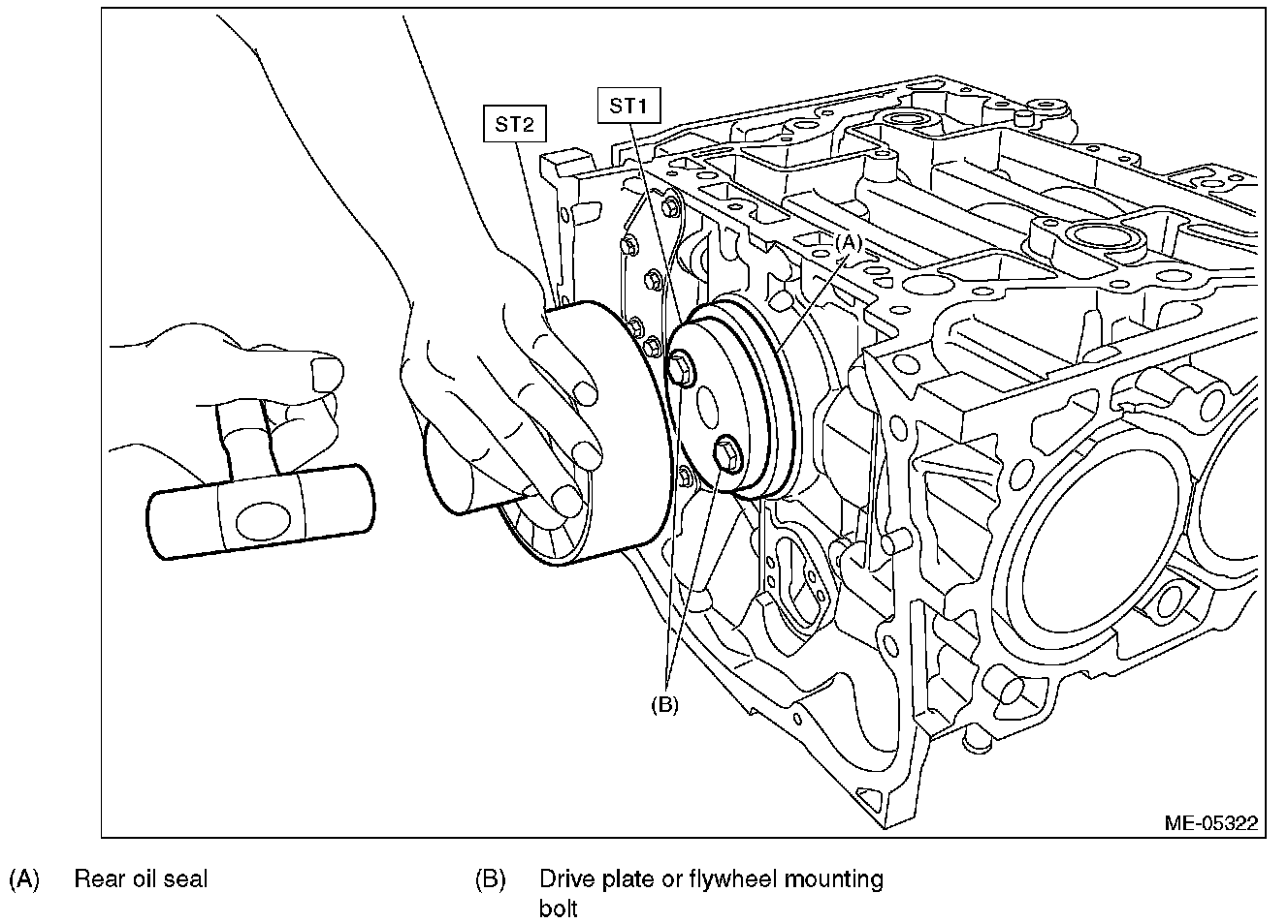 8) Apply a coat of engine oil to the oil seal inner periphery and outer periphery, and install the rear oil seal using ST1 and ST2.