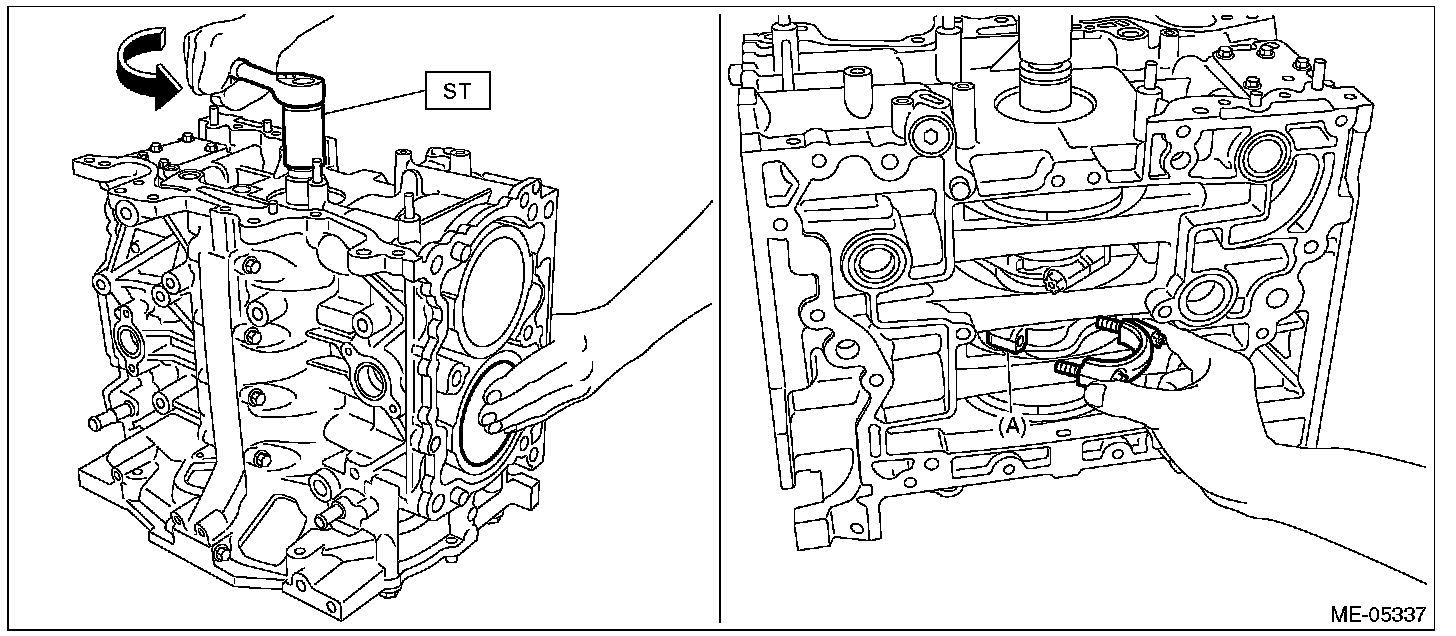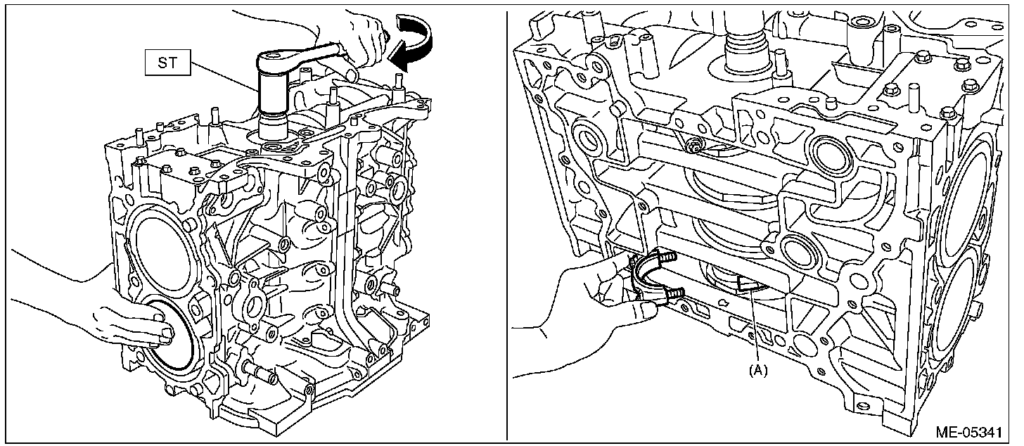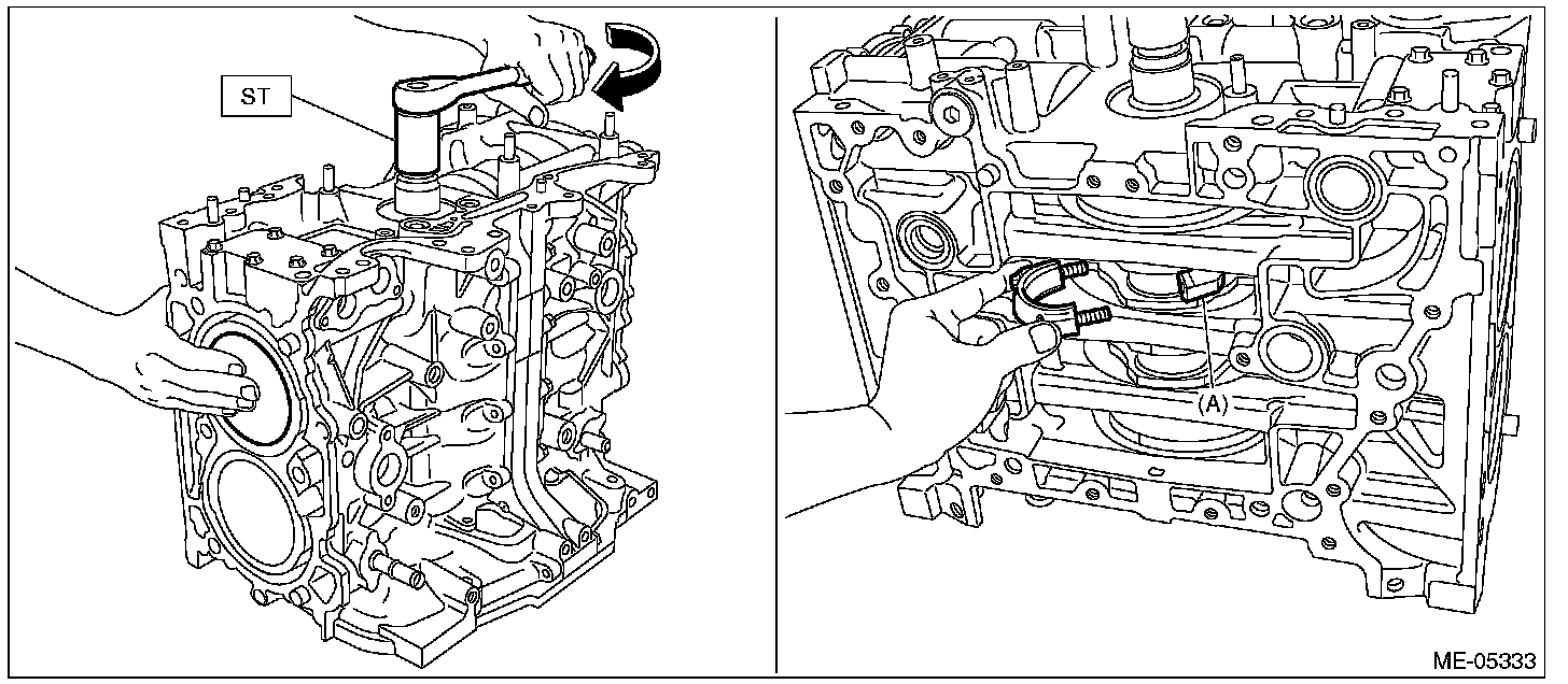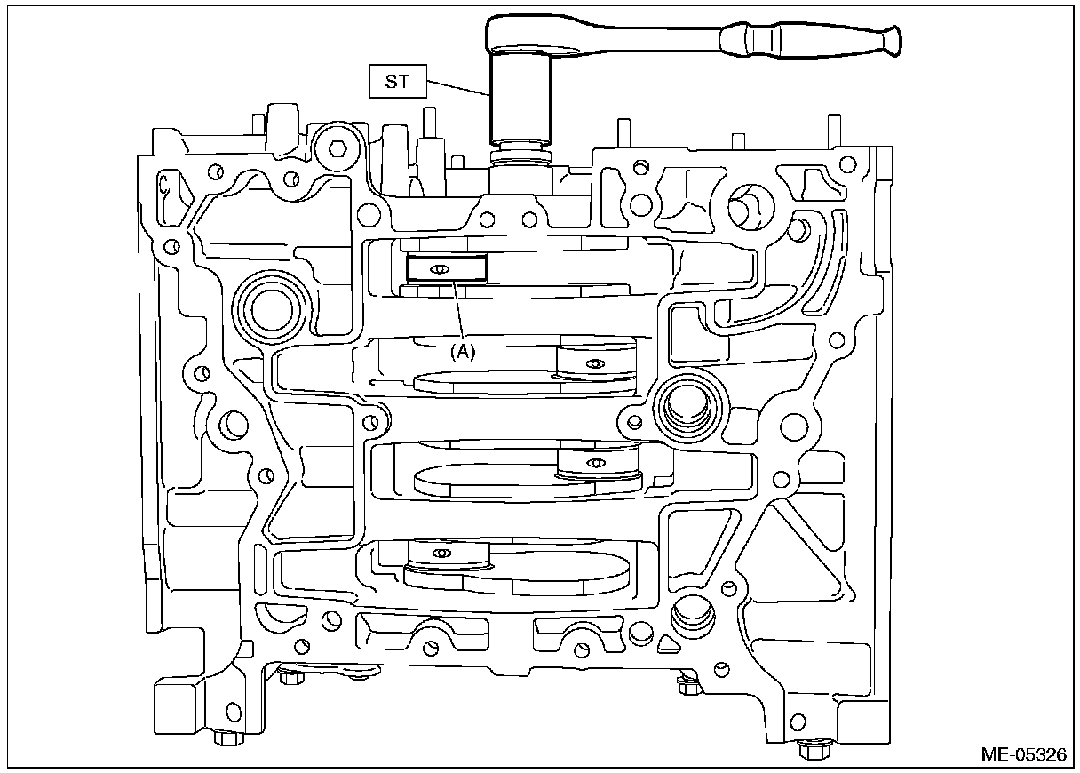 (8) Turn the crankshaft clockwise so that the #2 crank pin and the large end of #2 connecting rod (A) are positioned as shown in the figure using ST, while pressing the #2 piston crown, and then set the #2 connecting rod cap and #2 connecting rod cap bolt.