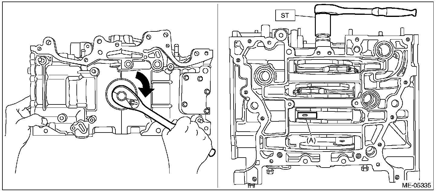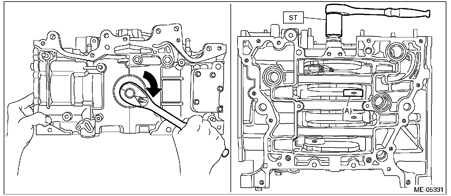 (4) Turn the crankshaft counterclockwise so that the #1 crank pin and the large end of #1 connecting rod (A) are positioned as shown in the figure using ST, while pressing the #1 piston crown, and then set the #1 connecting rod cap and #1 connecting rod cap bolt.
