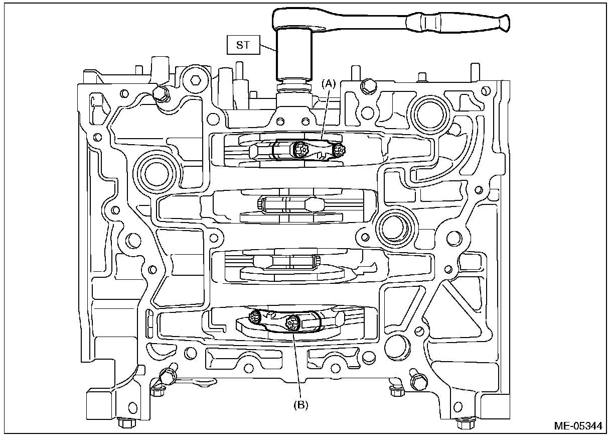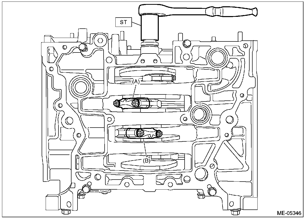 (19) Turn the crankshaft so that the #1 connecting rod cap (A) and #4 connecting rod cap (B) is located at the position shown in the figure using ST.