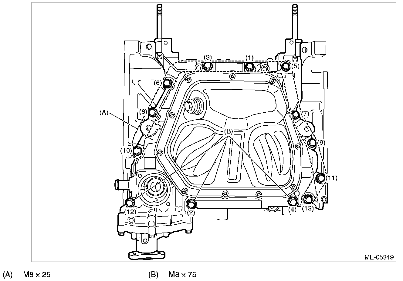 (3) Set the oil pan with oil pan upper to the cylinder block, and tighten the bolts in numerical order as shown in the figure.