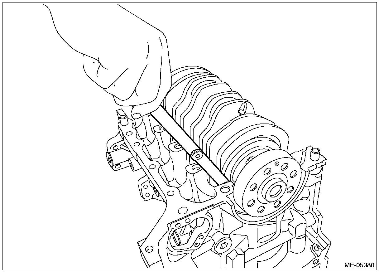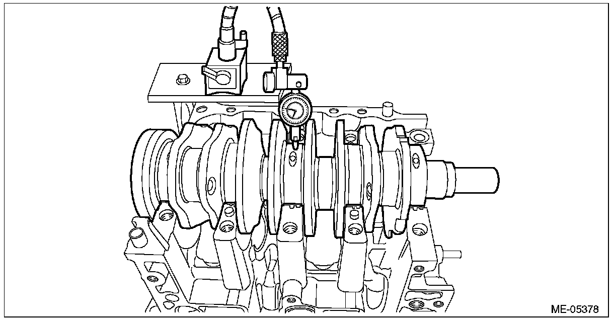 ^ If a suitable V-block is not available, using just the #1 and #5 crankshaft bearings on cylinder block, position the crankshaft on cylinder block. Then, measure the crankshaft bend using a dial gauge.