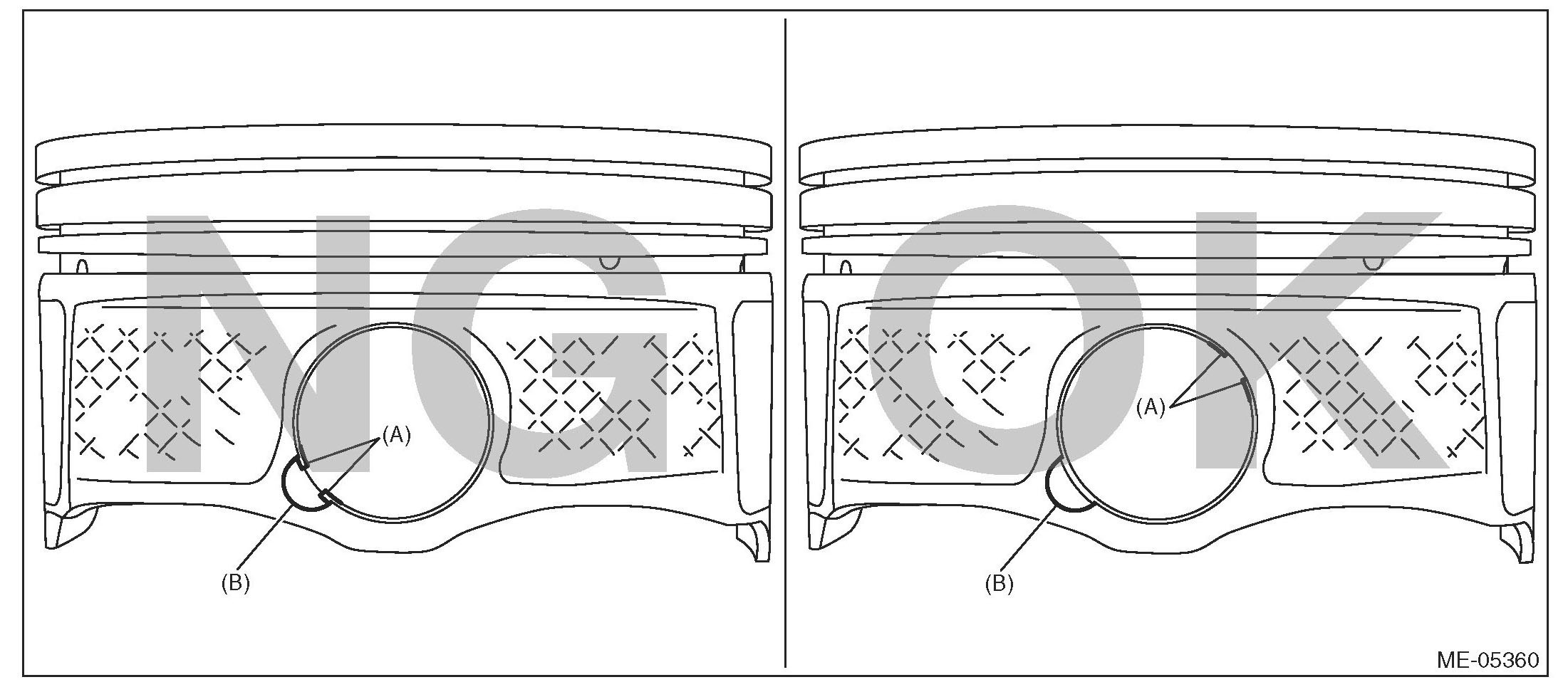 ^ After circlip installation, turn the circlip so that the ends of circlip (A) and the cutout portion of circlip (B) do not match.