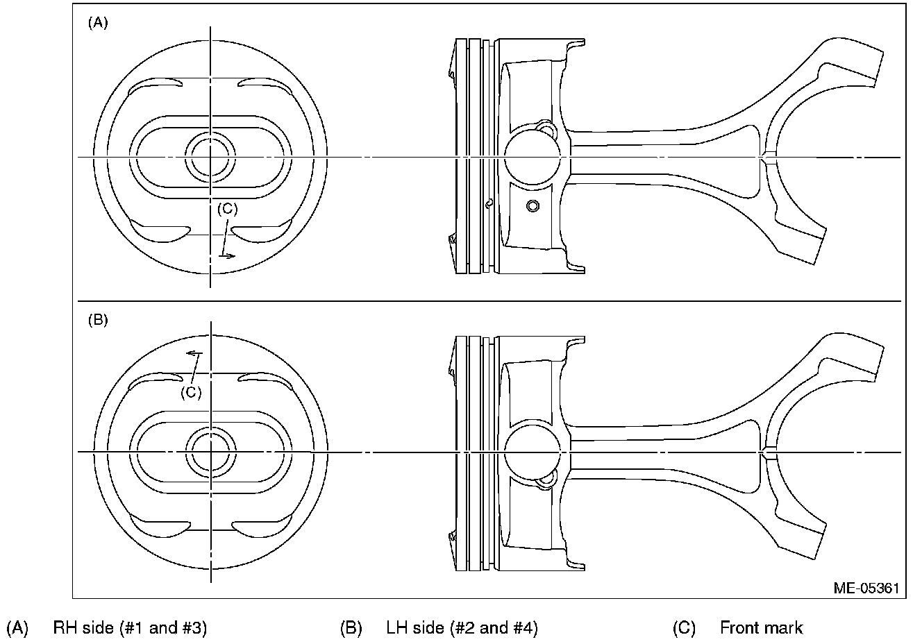 Align the front mark of piston and the connecting rod direction correctly as shown in the figure.