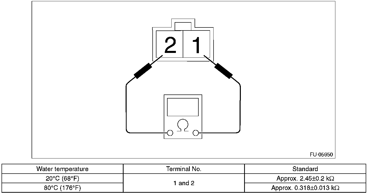 3. Raise water temperature gradually, measure the resistance between the engine oil temperature sensor terminals when the temperature is 20 °C (68 °F) and 80 °C (176 °F).