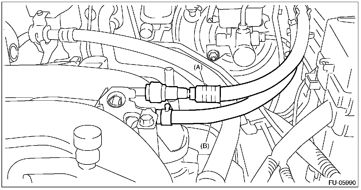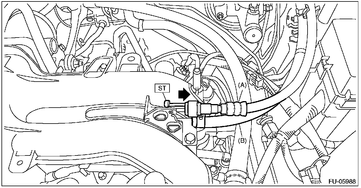 1. Attach ST to the fuel delivery pipe and push ST in the direction of arrow mark to disconnect the quick connector of the fuel delivery hose (A).