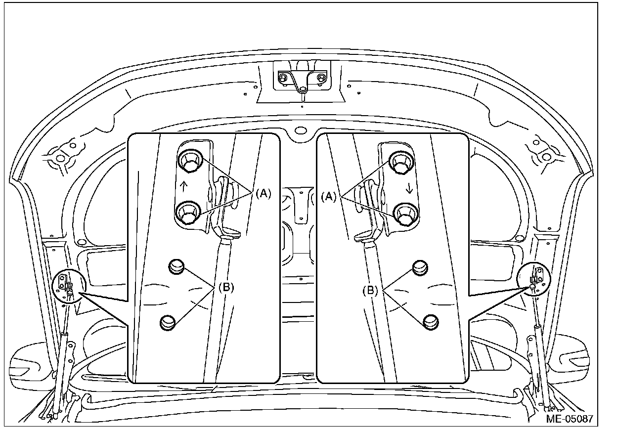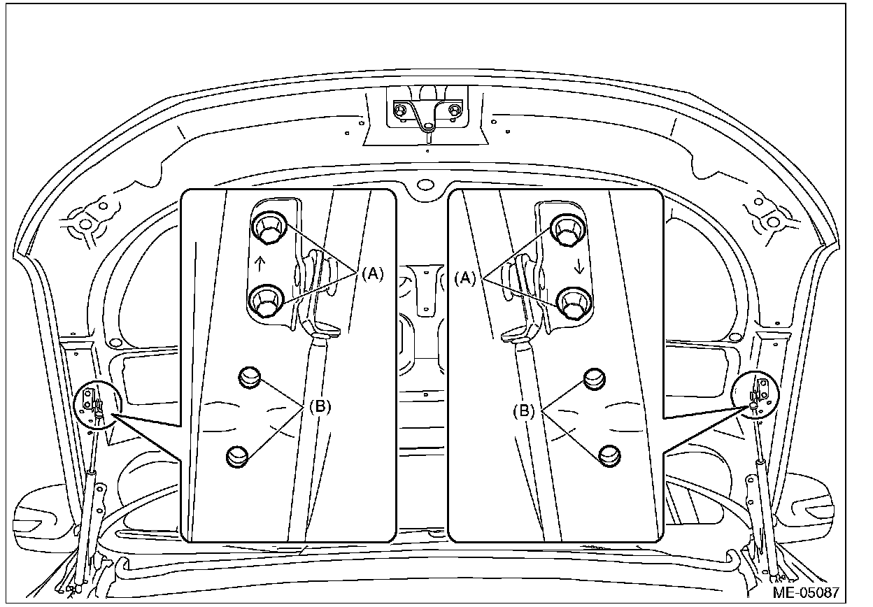 1) Change the bolt installation position from (A) to (B), then open the front hood completely.