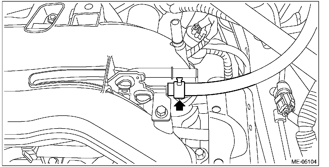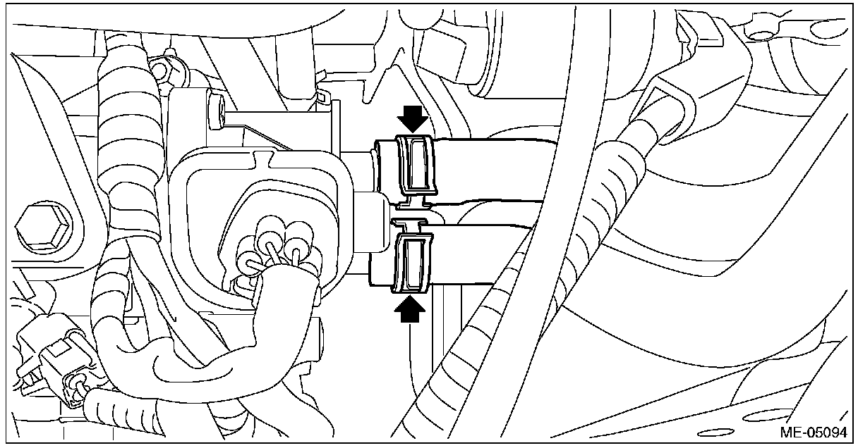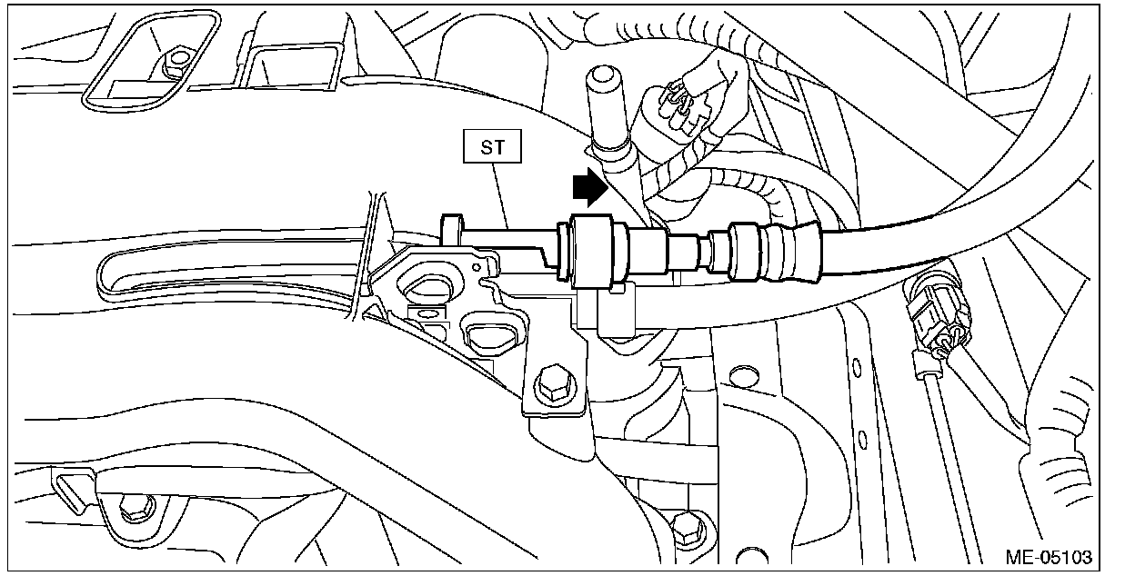 (1) Attach ST to the fuel delivery pipe and push ST in the direction of arrow mark to disconnect the quick connector of the fuel delivery hose.