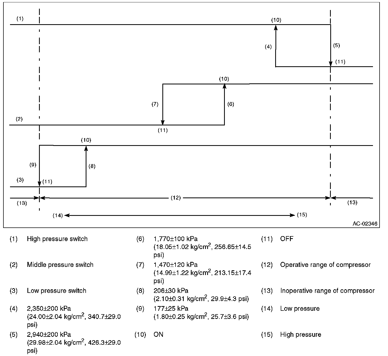3. Start the air conditioner, and check the operating pressure of switch by turning the compressor (magnet clutch) to ON/OFF. Operation of each switch is as follows.