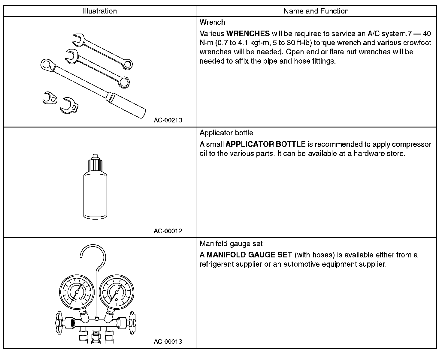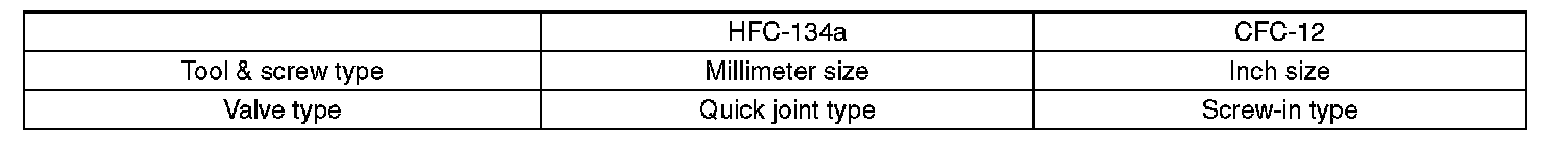 CAUTION: When working on vehicles with a HFC-134a system, only use HFC-134a specified tools and parts. Do not mix CFC-12 tools and parts. If HFC-134a and CFC-12 refrigerant or compressor oil is mixed, it will result in poor lubrication and the compressor itself may be damaged. In order to prevent the mixture of HFC-134a and CFC-12 parts and liquid, the type of tool and screw, and the replacement valves used are different. The gas leak detectors for the HFC-134a and CFC-12 systems must also not be interchanged.