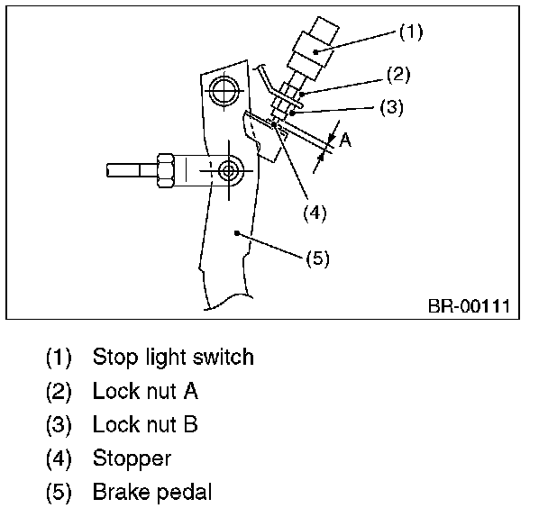 Loosen the lock nut, and adjust the stop light switch position until the clearance (A) between the threaded end of the stop light switch and stopper becomes 0.3 mm (0.012 in). Then, tighten the lock nut.