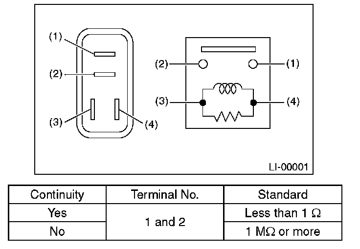 1. Connect terminal No. 4 to the battery positive terminal and the terminal No. 3 to the battery negative terminal, and check the resistance value between the front fog light relay terminals.