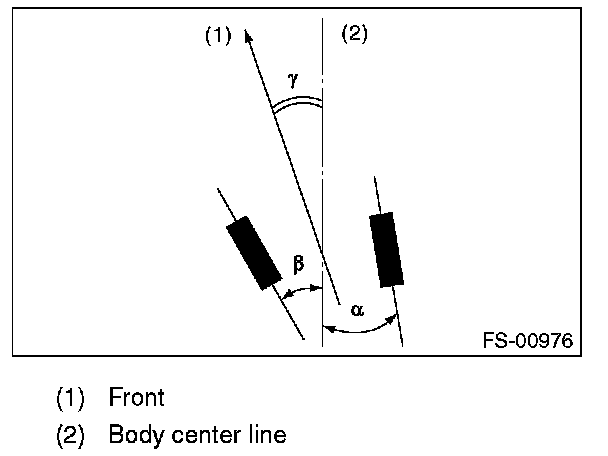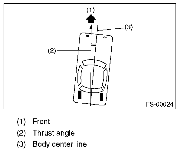 Thrust angle is a mean value of left and right wheel toe angles in relation to the vehicle body center line. Vehicle is driven straight in the thrust angle direction while slanting in the oblique direction depending on the degree of the mean thrust angle.