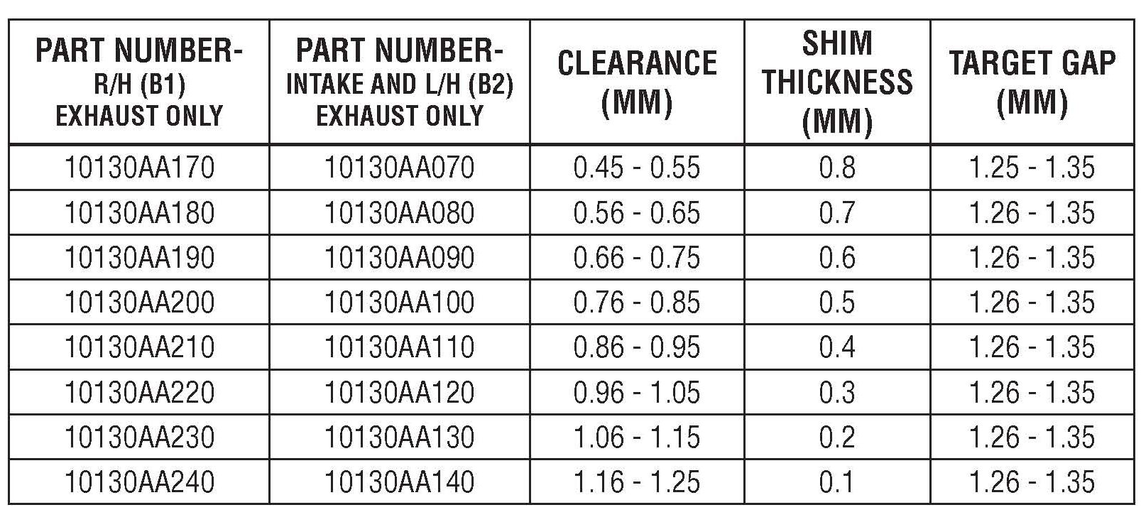 ^ Shim Kit, p.n. 10130AA060, contains 8 cam position sensor shims, 0.1 to 0.8mm in thickness.