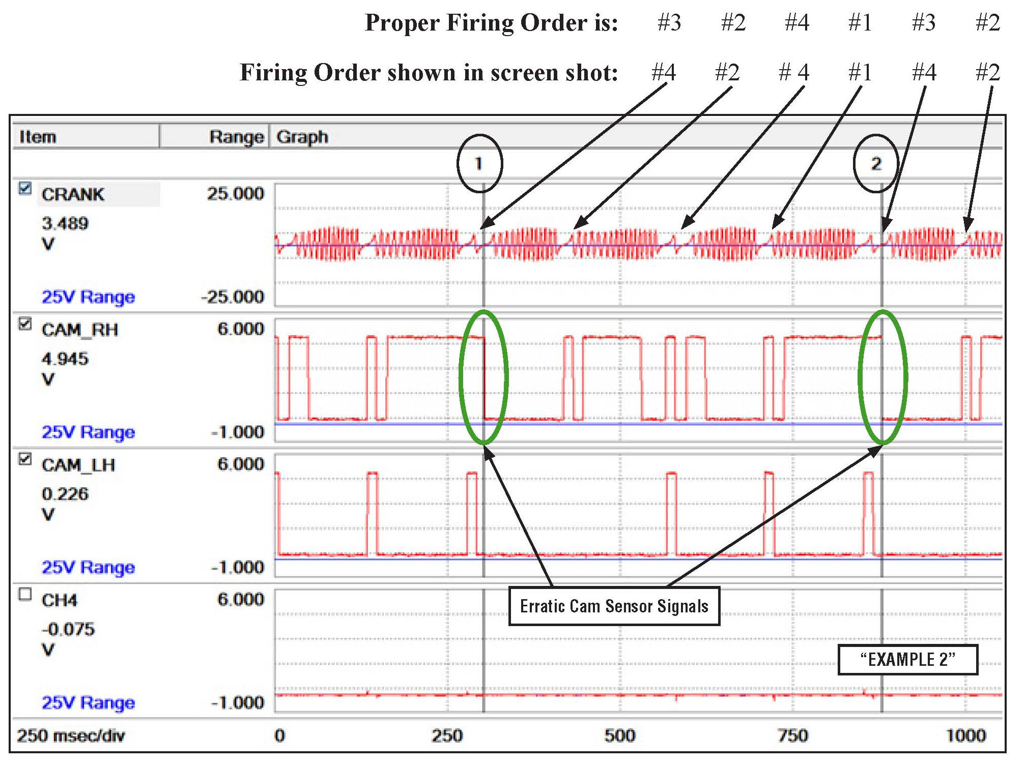 Example 2 shows a "Bad" pattern for the RH cam sensor. Marks # 1 and # 2 show what appears to be # 4 cylinder firing but, the next cylinder to fire according to the screen shot is # 2 followed by # 4 then # 1. The pattern for the RH sensor never shows the proper sequence to fire # 3 cylinder. In this case, recheck the data again after installing a .2mm shim under the RH cam sensor.