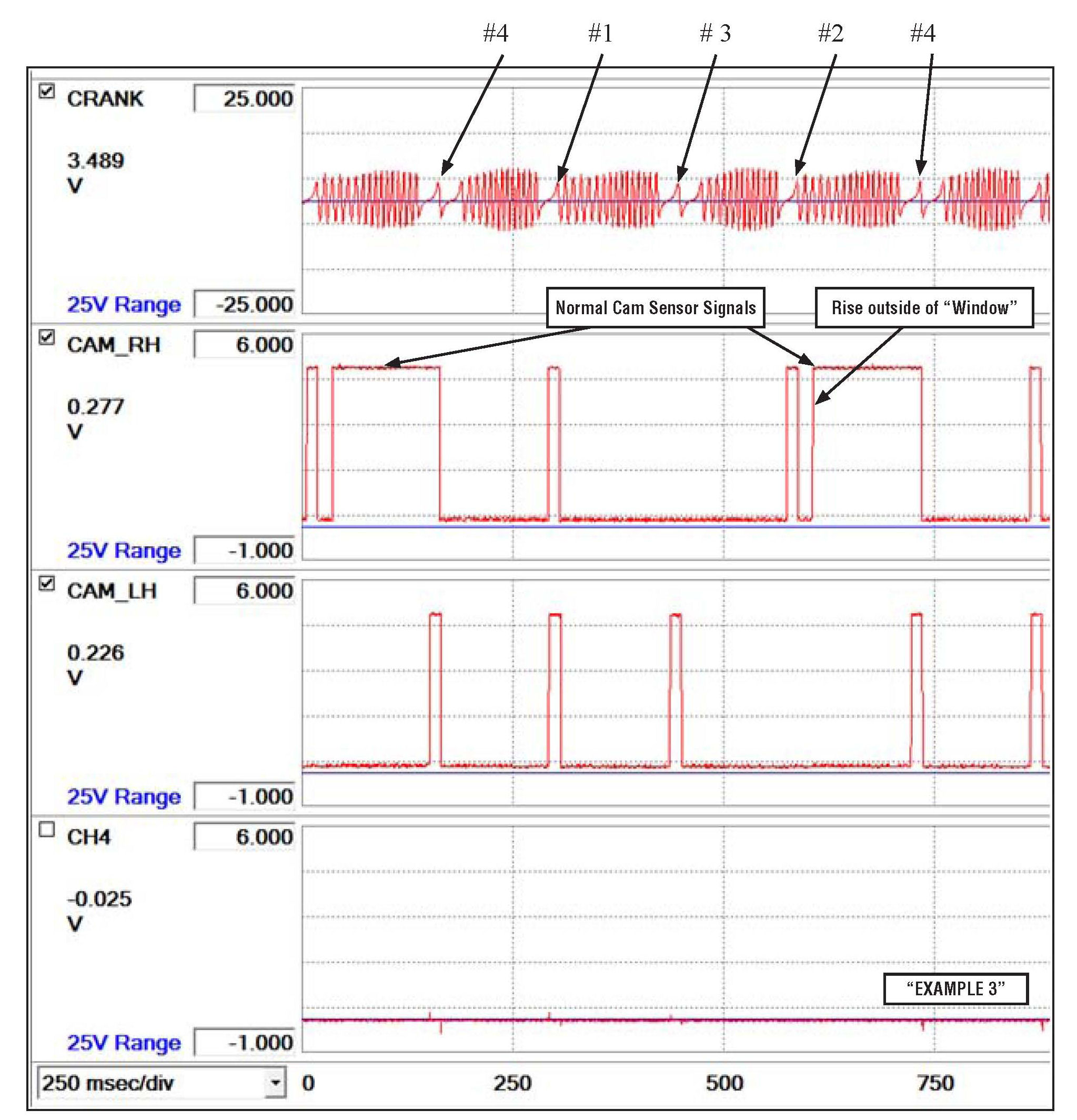 Example 3 shows what appears to be an erratic signal from the RH cam sensor but, you can see all the cam sensor data signal edges (drops) follow the chart and firing order as they are supposed to. Other signal edges (rises or drops) outside the "window" or a longer time line as shown here prior to the # 4 signal edges seen on the RH cam sensor pattern are examples of signals which will be "ignored" by the ECM and are not a cause for concern.