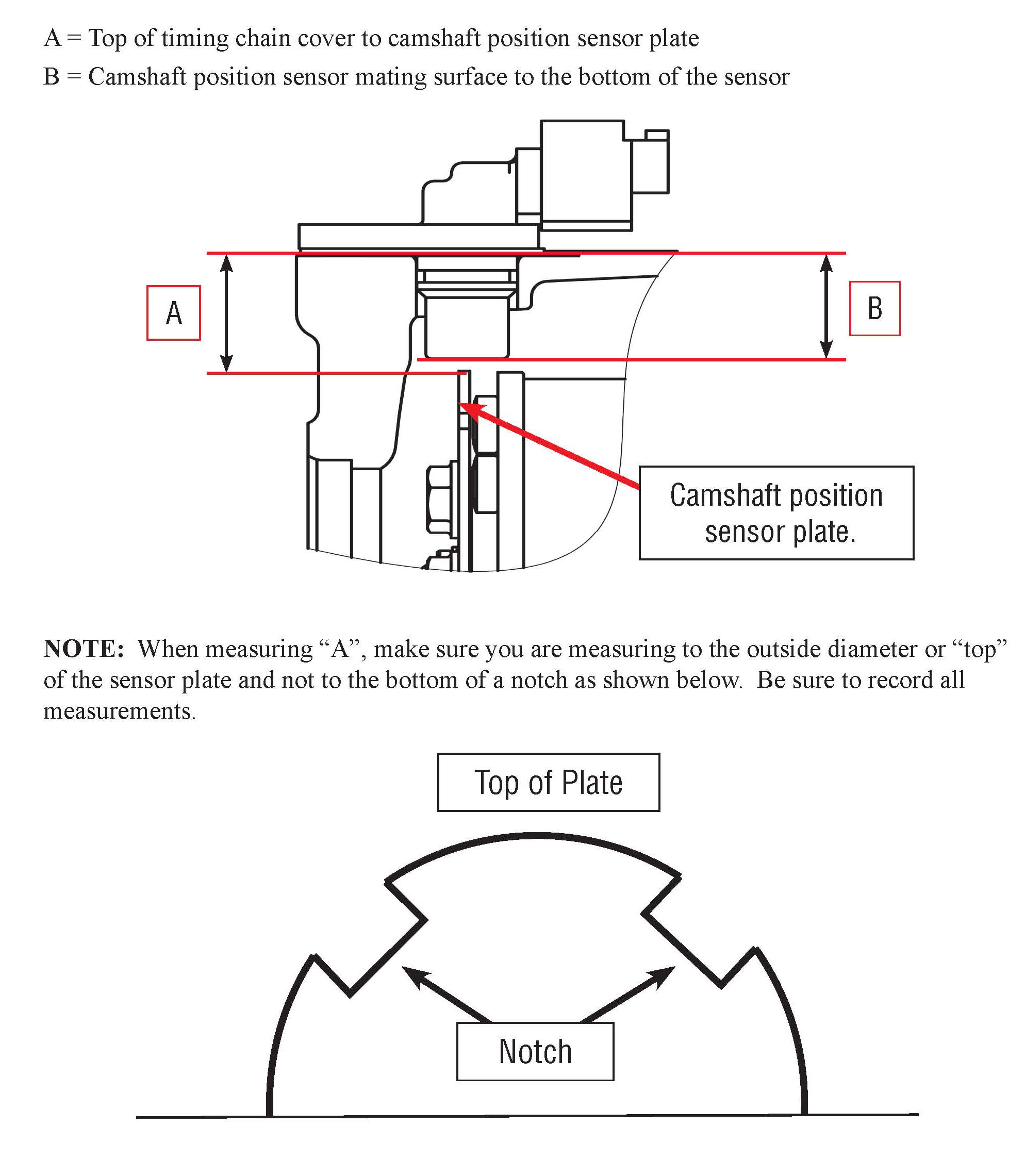 B = Camshaft position sensor mating surface to the bottom of the sensor