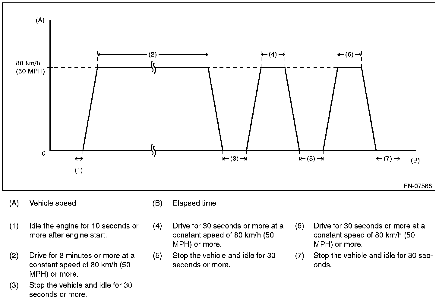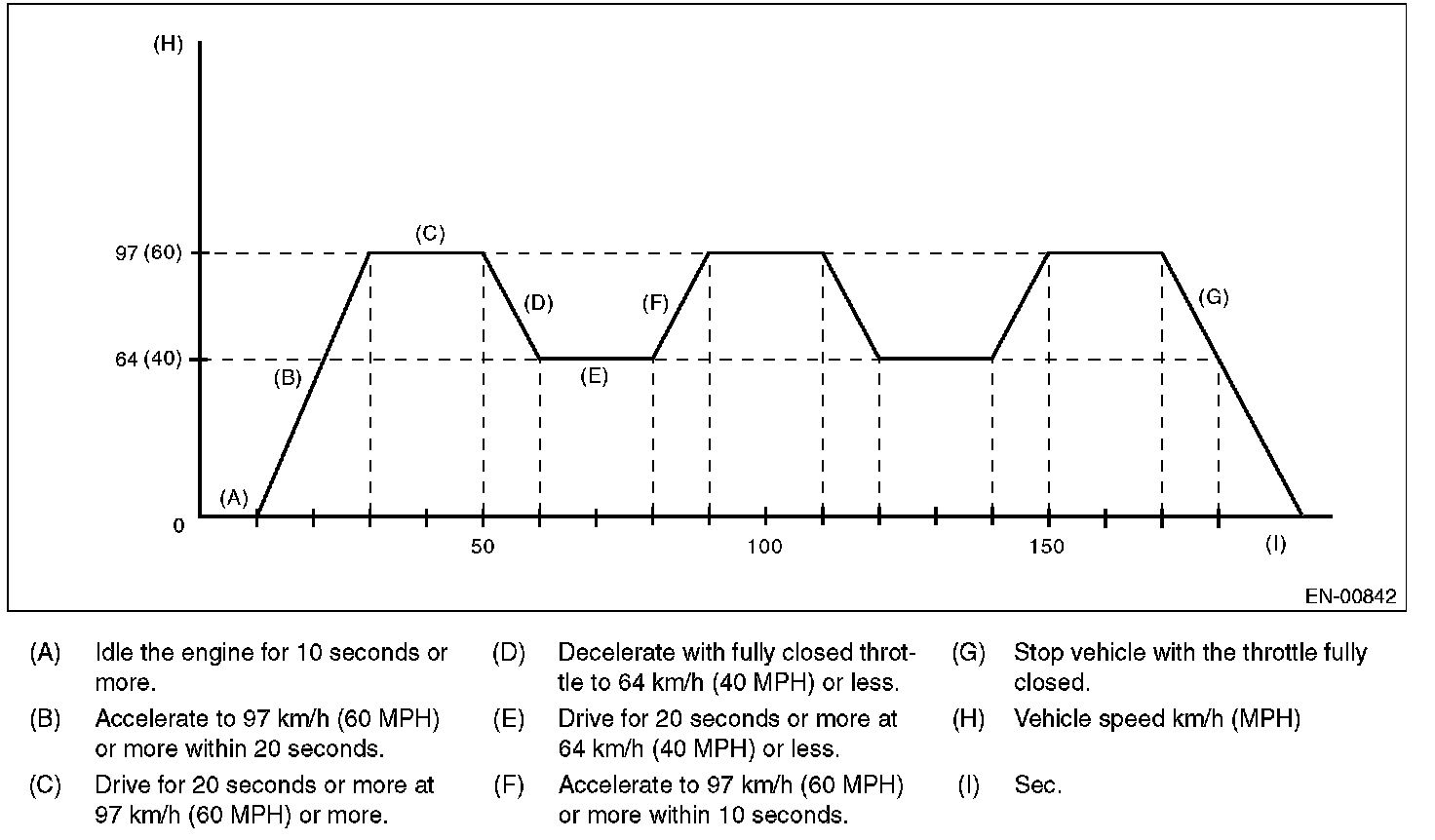 - If it is necessary to perform DRIVE CYCLE I consecutively, drive the vehicle under the following conditions to release accumulated evaporating gas. Performing the DRIVE CYCLE I consecutively without starting the engine causes a large amount of evaporating gas to accumulate in the canister, which hinders an accurate diagnosis.