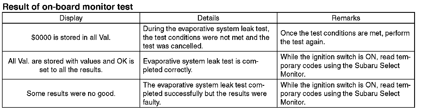 - The Subaru Select Monitor screen does not change after the evaporative system leak test is complete or when the test is aborted by turning off the ignition switch.