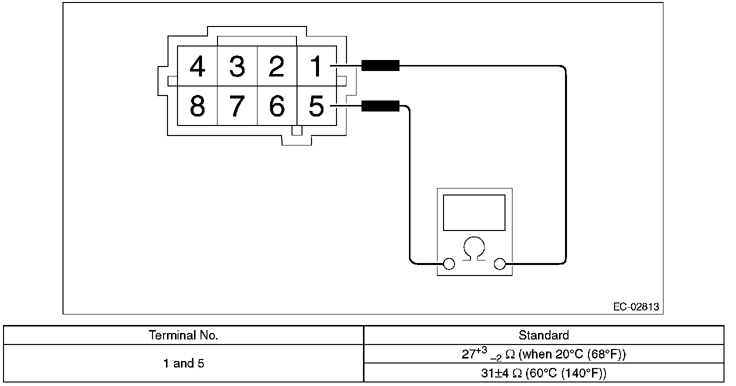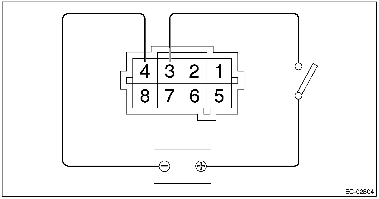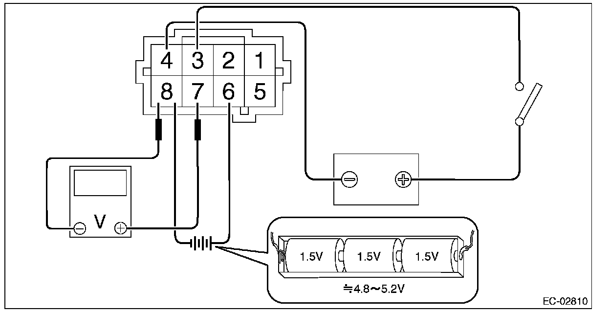 1. Connect dry-cell battery positive terminal to terminal No. 6 and dry-cell battery ground terminal to terminal No. 8, circuit tester positive terminal to terminal No. 7 and the circuit tester negative terminal to terminal No. 8.