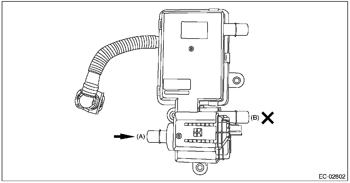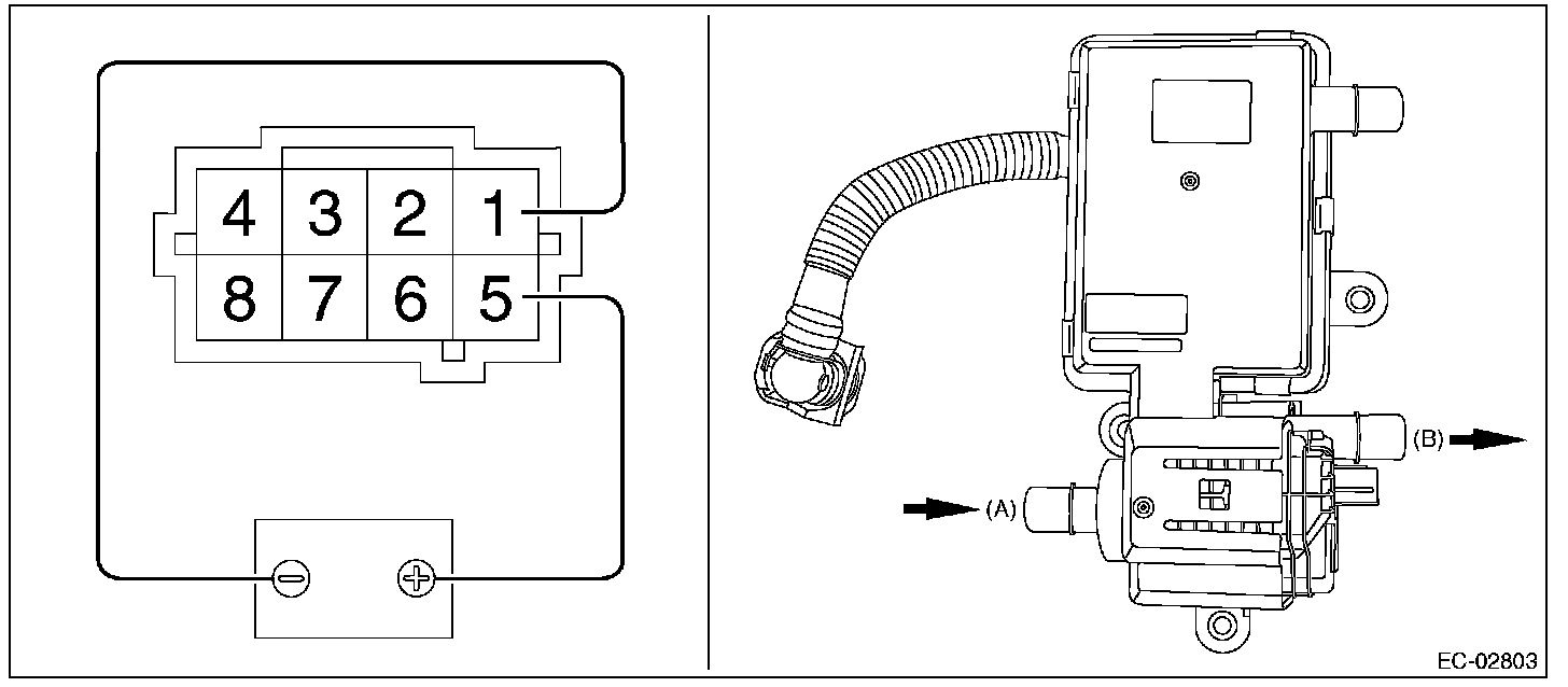 4. Connect the battery positive terminal to the terminal No. 5 and the battery negative terminal to the terminal No. 1. Check that air is discharged from (B), when supplying air to (A).