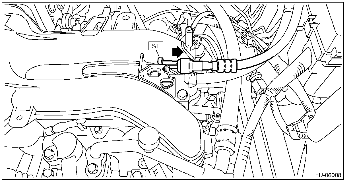 2. Attach ST to the fuel delivery pipe and push ST in the direction of arrow mark to disconnect the fuel delivery hose.