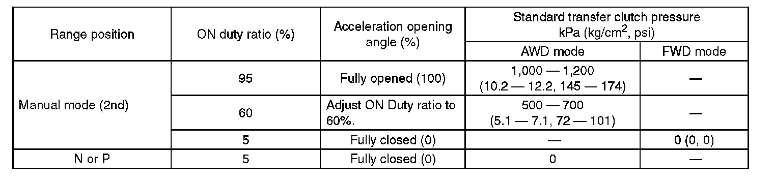 Check the transfer clutch pressure in accordance with the following chart in the same manner as for line pressure. Line Pressure Test