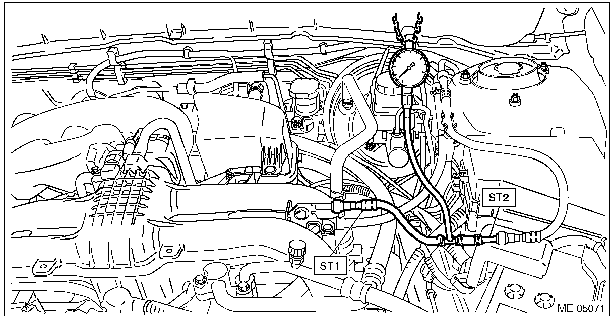 (2) Connect the fuel pressure gauge with ST1 and ST2.