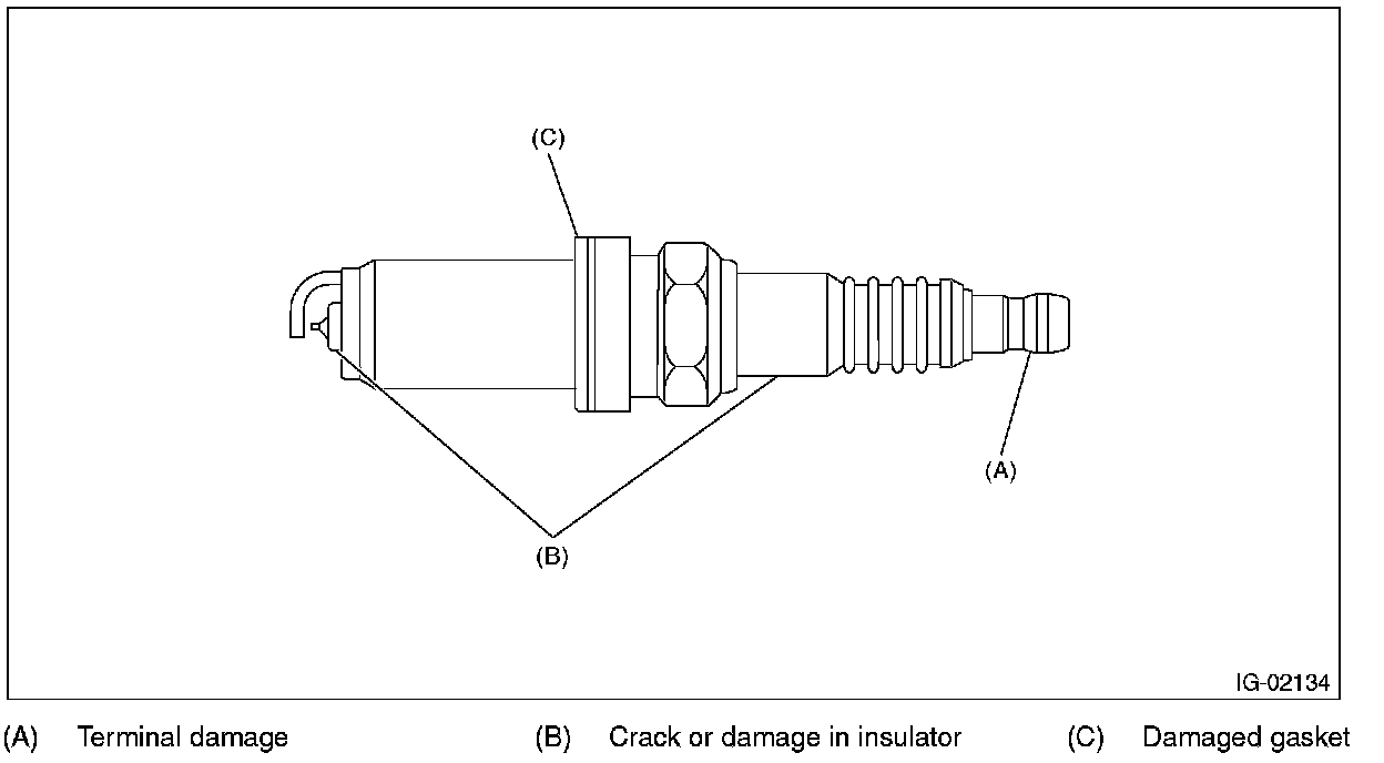 2. Check the spark plug electrode and condition of the insulator. If abnormal, check and repair the cause and replace the spark plug.
