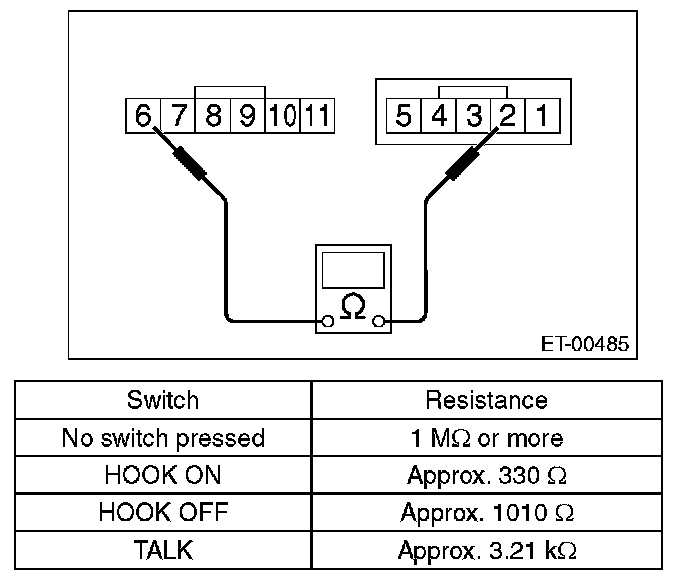 3. If internal resistance is out of specification shown in the above table, replace the steering switch.