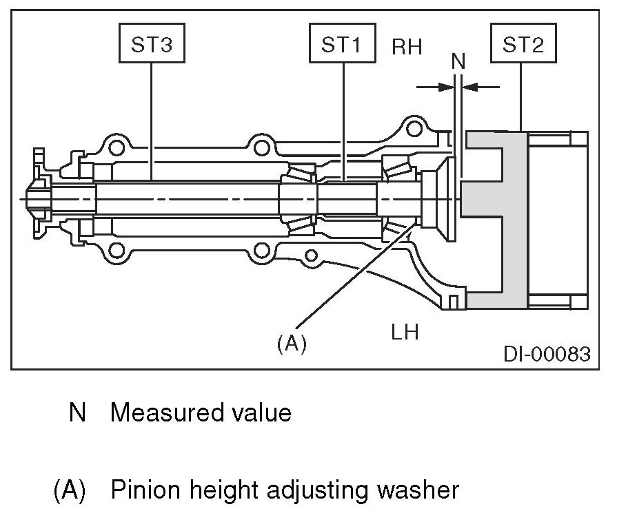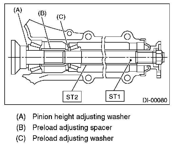 At this time, install a provisionally selected or previously used pinion height adjusting washer. Measure and record the thickness.