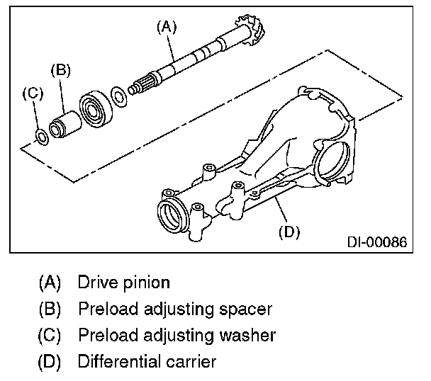 Adjust the bearing preload between front and rear bearings with spacer and washer. Pinion height adjusting washer is not affected by this adjustment.